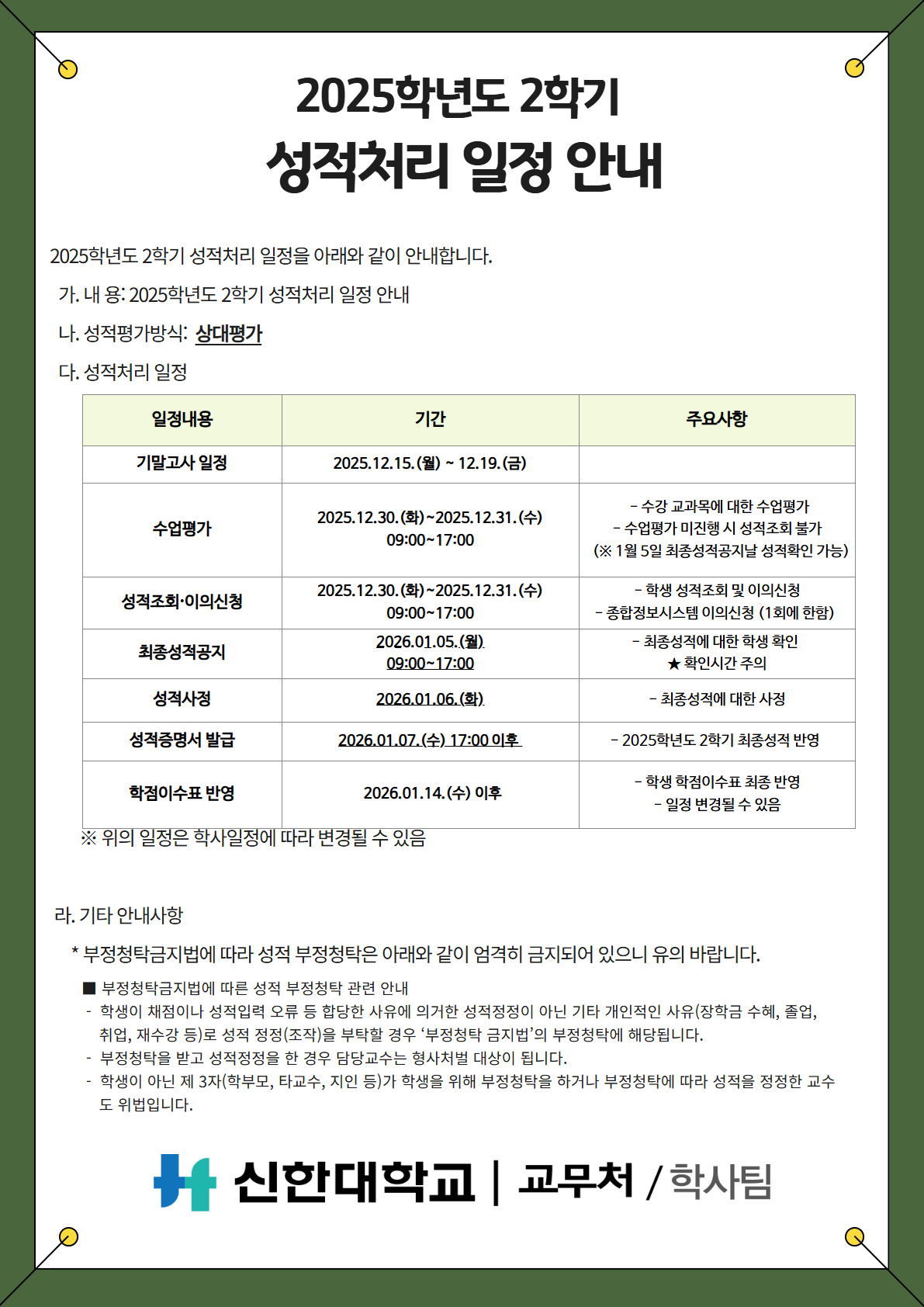 [학사팀/성적] 2025학년도 2학기 성적처리일정 안내 (수정)