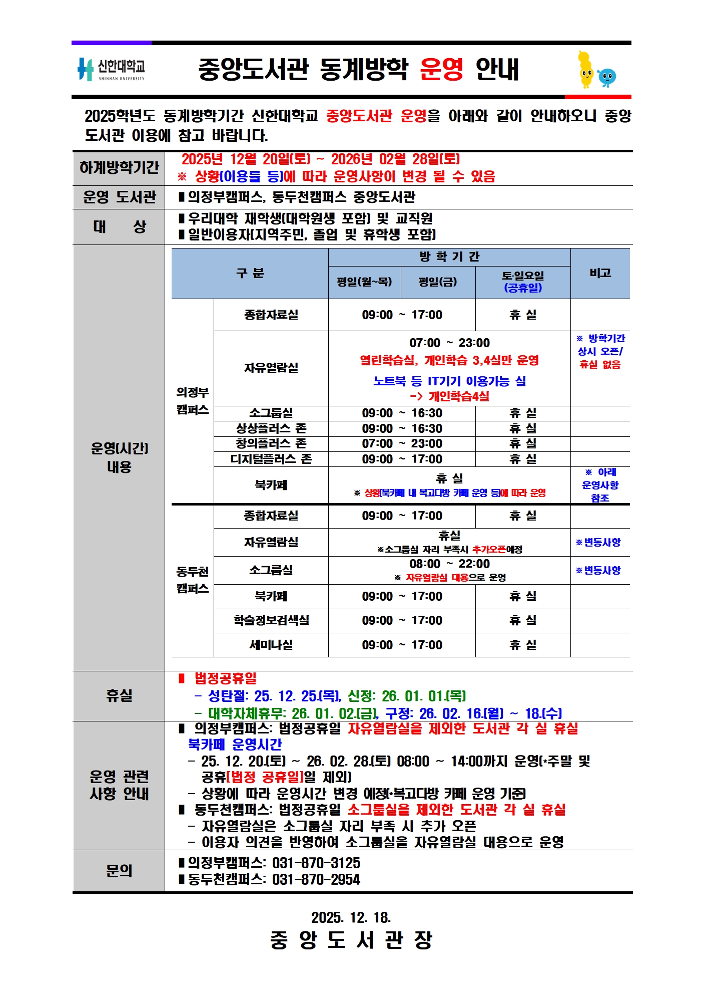 2025학년도 동계방학기간 신한대학교 중앙도서관 운영을 아래와 같이 안내 하오니 이용에 참고 바랍니다.
