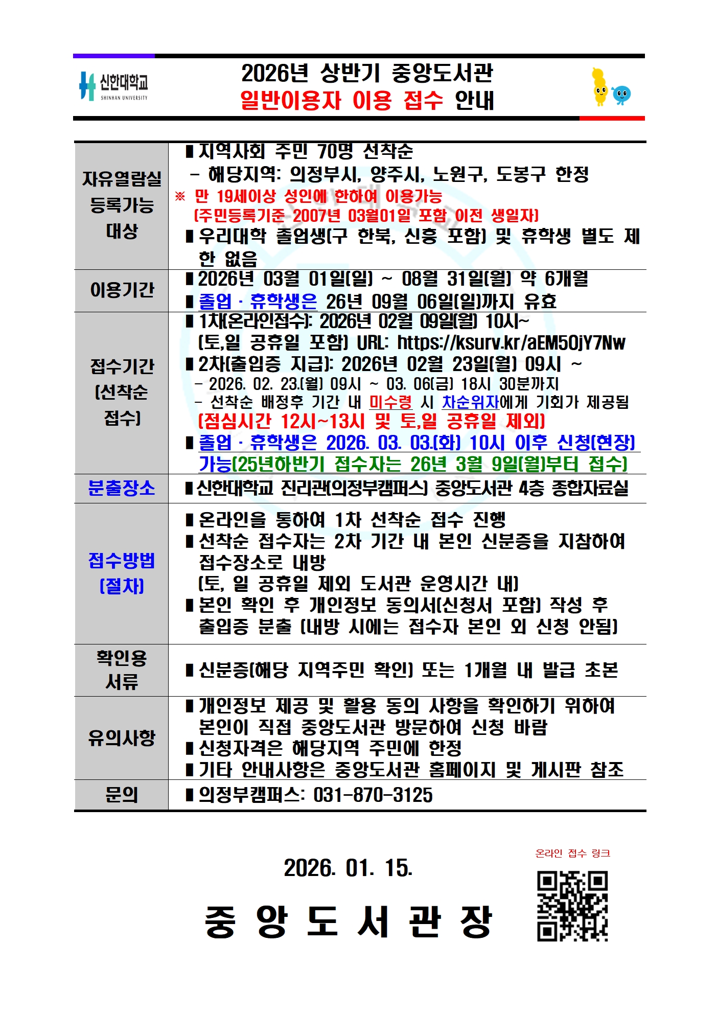 [중앙도서관] 2026년 상반기 중앙도서관 일반이용자 이용 접수 안내