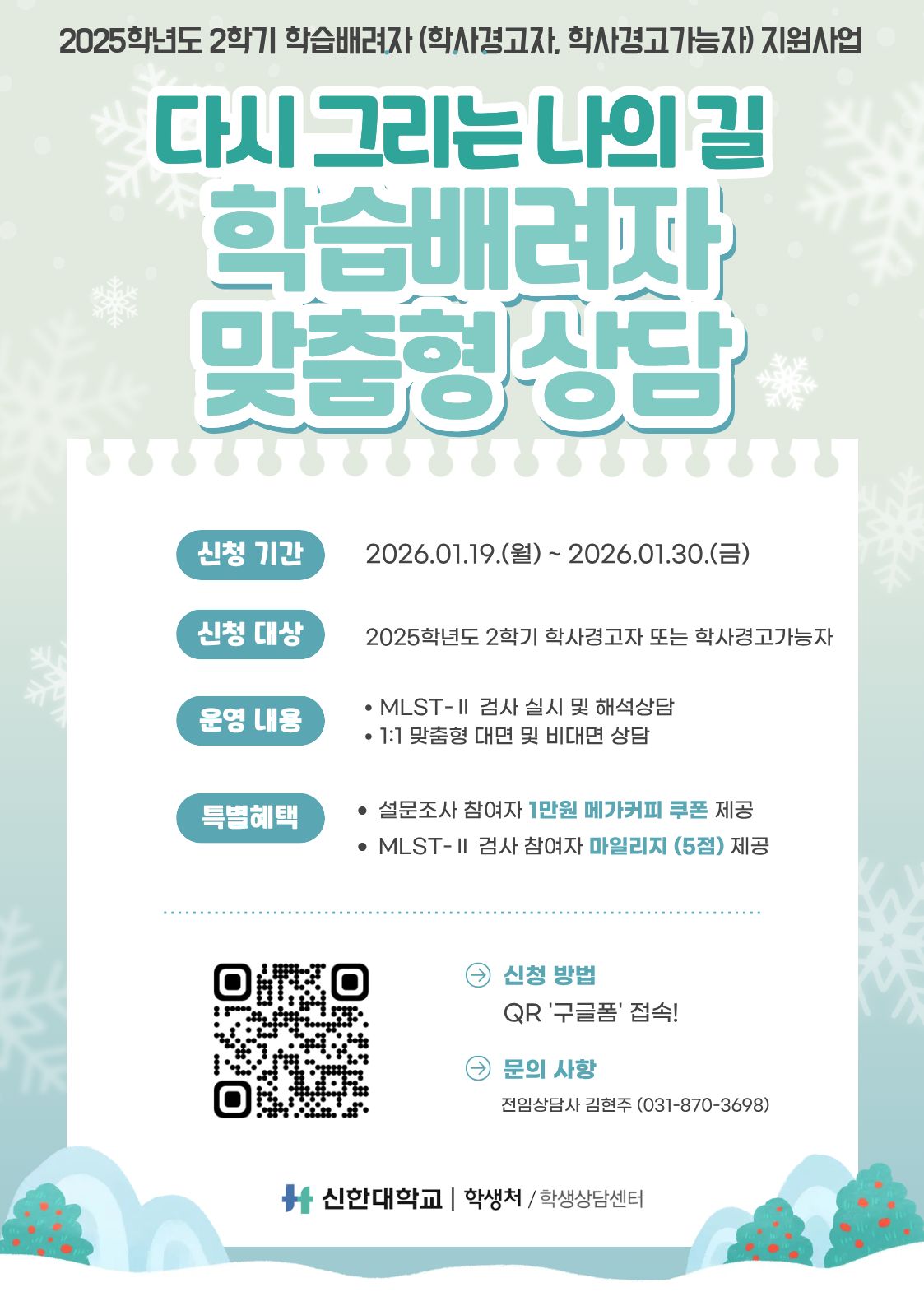 [학생상담센터] 2025학년도 2학기 학습배려자(학사경고자, 학사경고가능자)를 위한 맞춤형 상담 지원 프로그램 안내