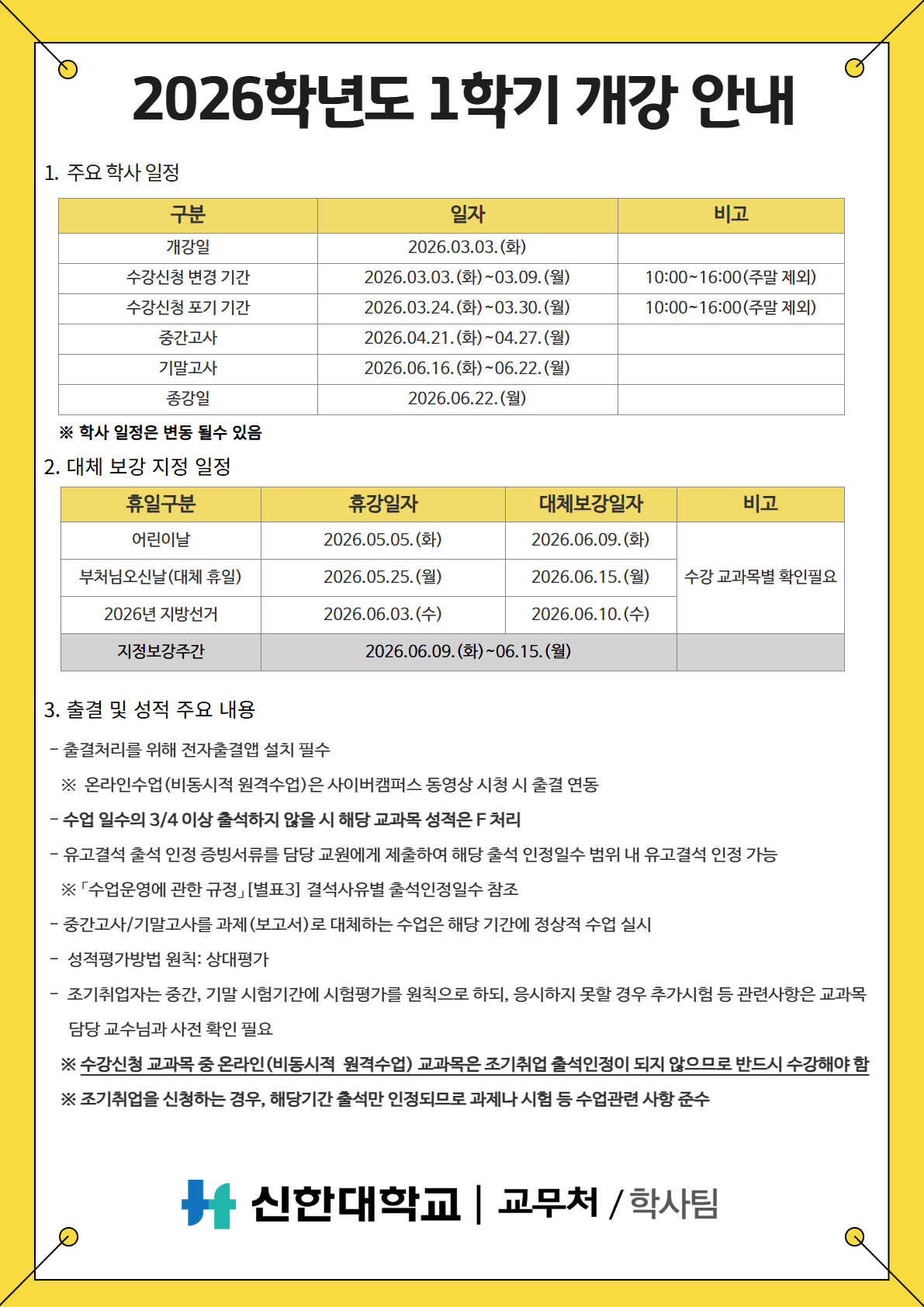 [학사팀/수업] 2026학년도 1학기 개강 관련 일정 안내
